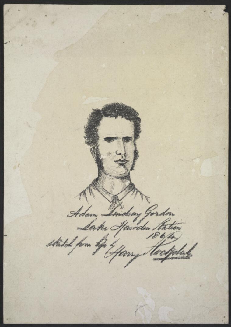 | 26. Pictures Catalogue - Stockdale, Harry, Ca. 1841-1919. Adam Lindsay Gordon, Lake R6869. Subjects Gordon, Adam Lindsay, 18331870 Portraits. Poets,Australian 19th century Portraits. Picture Portrait. http://nla.gov.au/nla.pic-an6054553 | |